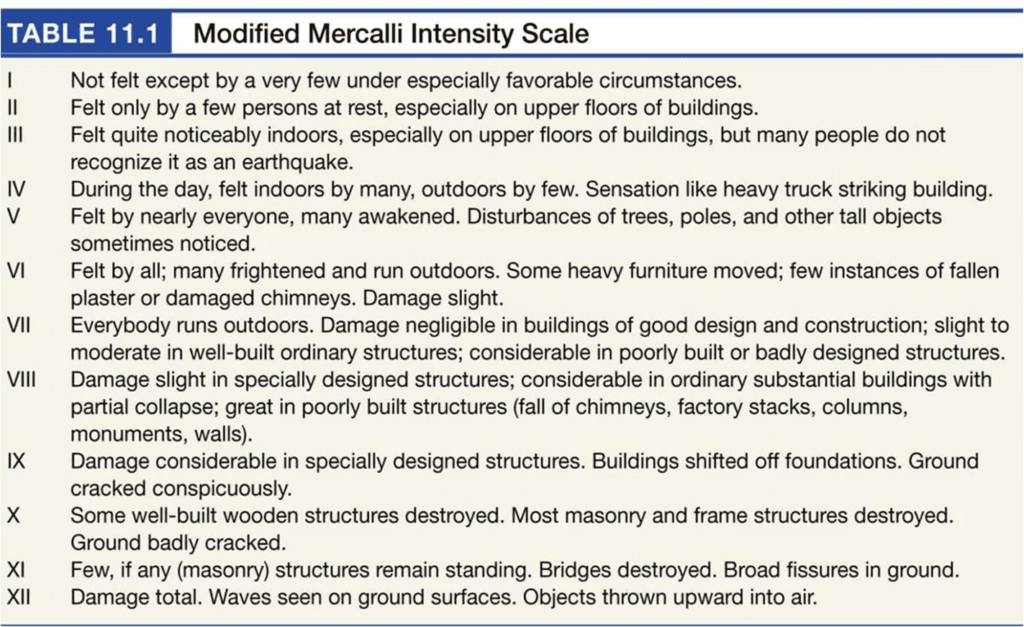 • indicator of degree of shaking at a given locale, based on movement and damage.