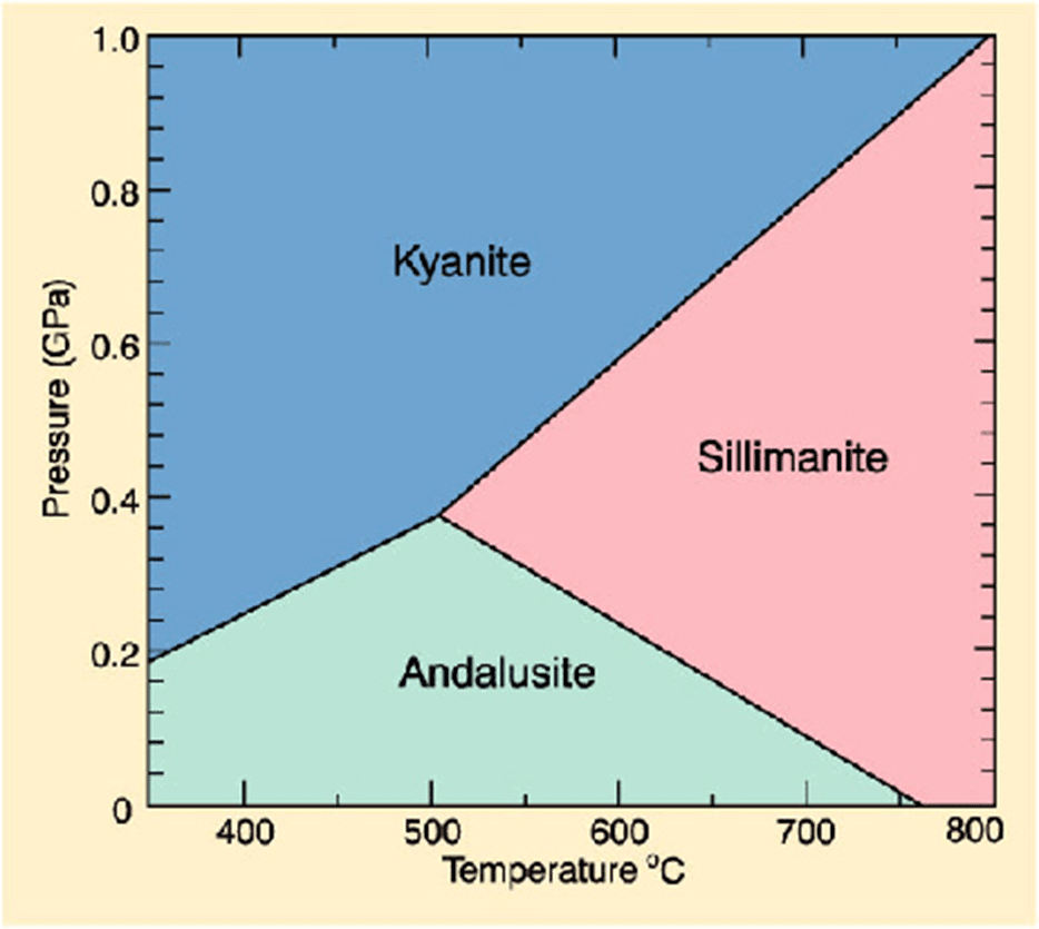 To the right is a Pressure-Temperature diagram for the composition Al2SiO5.  Depending on the specific pressure and temperature, Al2SiO5 will be a unique mineral.